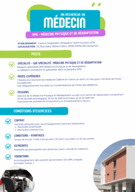 Médecin spécialiste MPR Médecine physique et de réadaptation ou Médecin souhaitant se spécialiser dans la discipline MPR.