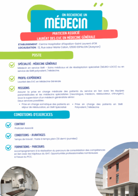 Vous renforcerez l’équipe médicale dont le projet est de poursuivre les activités de médecine, et SMR Spécialisé et polyvalent, et de développer d’autres projets en lien avec le GHT pour répondre au besoin du territoire.